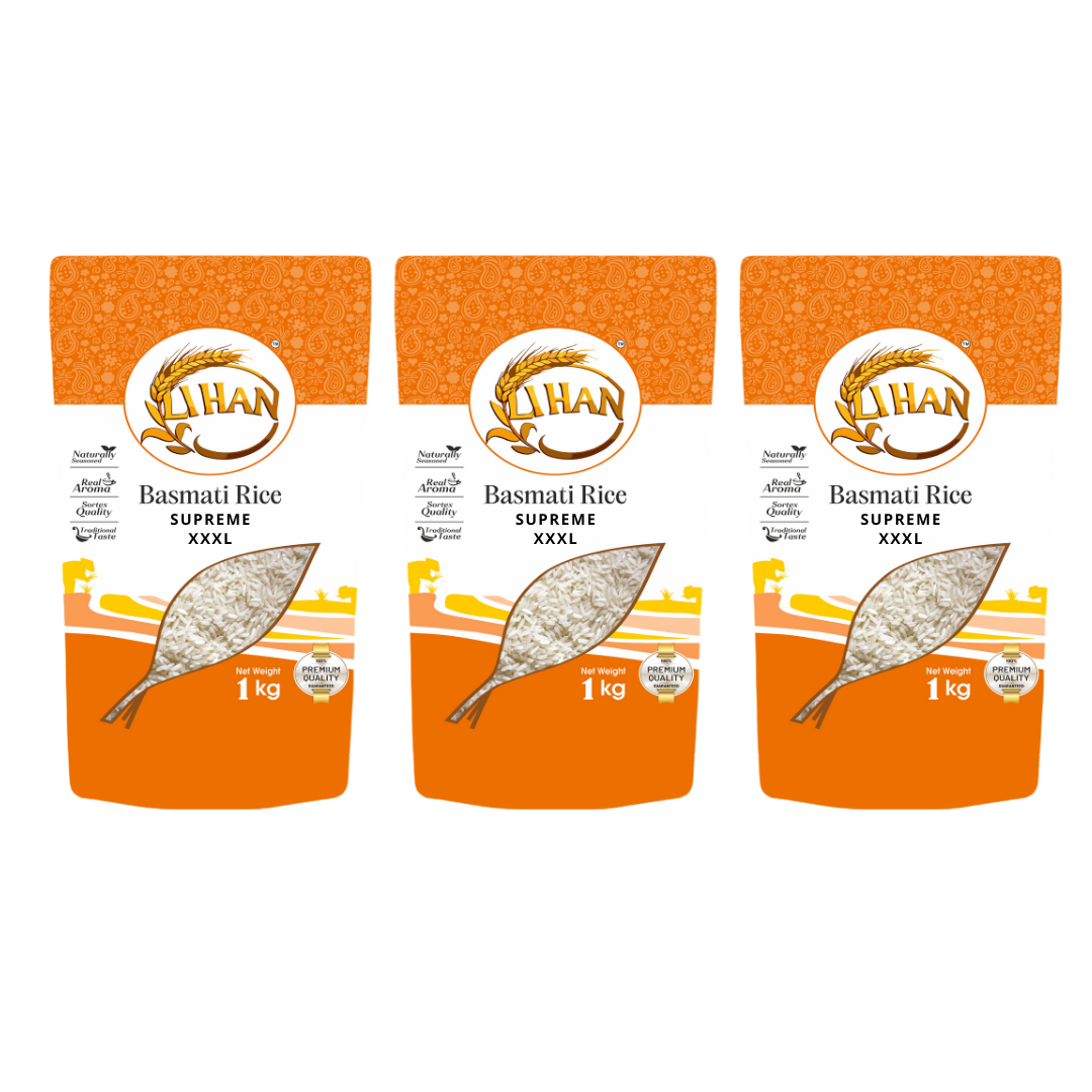 Lihan Supreme XXXL Basmati Rice is crafted for those who love quality and flavor in every grain. Aged naturally for enhanced taste and aroma, our rice features extra-long, fluffy grains that remain separate and non-sticky after cooking. This 3-pack of 1kg each is ideal for homes, chefs, and food enthusiasts who want consistency and excellence in every dish.